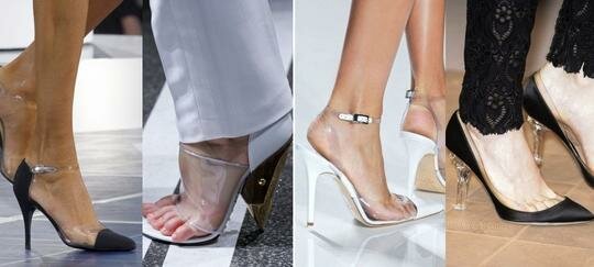 Также будут модными в этом сезоне модели обуви на прозрачном каблуке или танкетке. Воплощением этой фантазии занялись Stella McCartney и Valentino. Да что говорить, даже склонные к классическому стилю Chanel и Dior включили в свои коллекции пластиковые элементы.