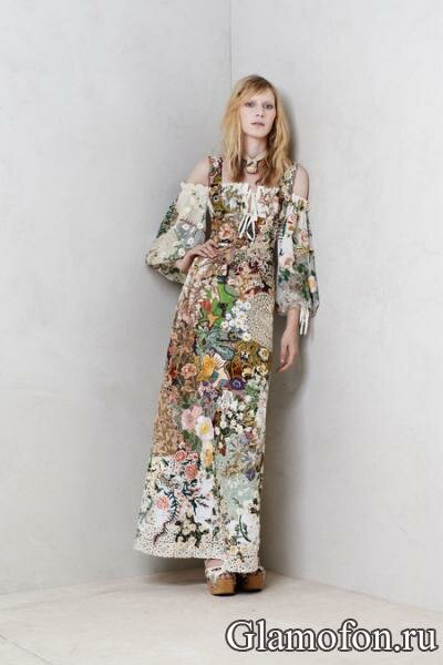 Одно из самых интересных платьев из последней коллекции - сочетает в себе сразу несколько трендов. Это длинно платье, отороченное по подолу кружевной оборкой. Своим кроем оно напоминает сарафан, а выбранная ткань отсылает нас к традиционным узорам и вышивкам народов мира. В сочетании с обувью на деревянной платформе и украшениями в том же стиле, мы получаем хит моды лета 2014: