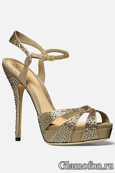Каблук и ремешки этих вечерних босоножек богато украшены камнями-стразами.