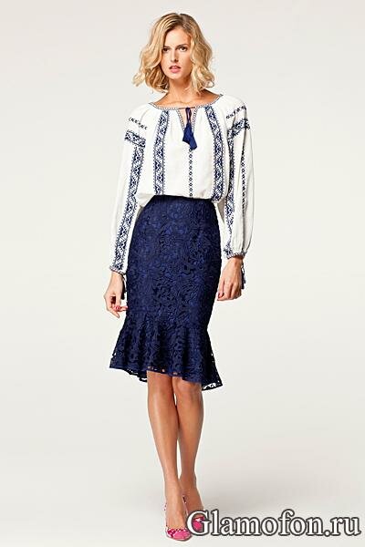 Синяя кружевная юбка карандаш и вышитая блуза Carolina Herrera весна лето 2013