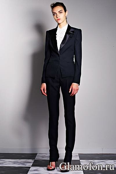 Женский брючный костюм с черным пиджаком и узкими брюками. Фото